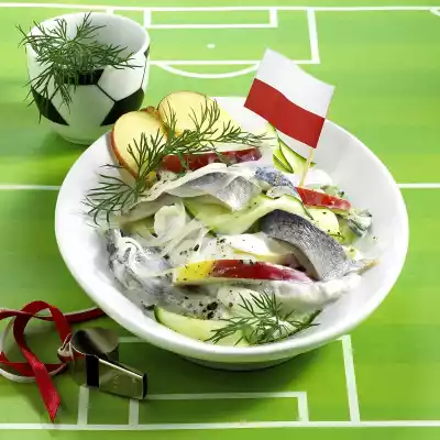 Peel onion and cut into fine rings. Cut herring fillets diagonally into pieces. Wash the apple, rub dry, quarter, core and cut into slices. Drizzle apple slices with lemon juice.