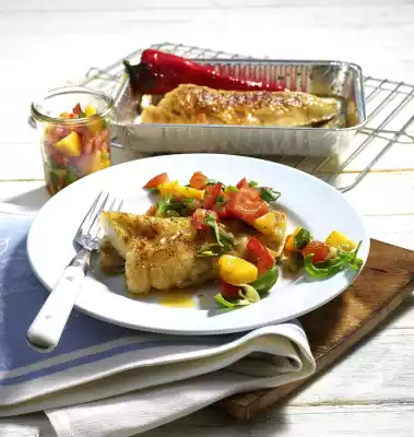 Wash basil, shake dry, pluck leaves, chop if necessary. Whip vinegar and oil. Season with salt, pepper and sugar. Mix prepared salad ingredients and mixed seasoning, season if necessary. Place the fish pieces on aluminium trays and cook on the hot grill for 5-10 minutes on each side. Delicious with long grilled peppers