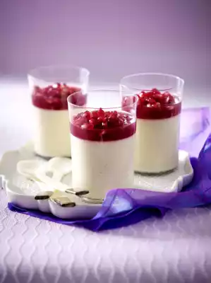 Soak 1 sheet of gelatine in cold water. Cut pomegranates in half. Remove the seeds from one half, remove the partitions and set aside. Squeeze the rest of the pomegranates, measure 150 ml of juice. Heat the juice and remove from the stove. Squeeze gelatine well and dissolve in the hot juice. Let the juice cool down. Spread the juice and pomegranate seeds on the panna cotta and chill for another 2 hours