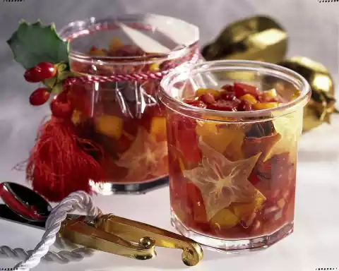 Reduce the relish for about 20 minutes until almost all the liquid has evaporated. Steam carambola slices for the last 5 minutes. Season to taste with salt and pepper. Fill the relish into clean glasses and close them. Filled up to the brim in glasses with twist-off lids it will last 3-4 weeks. Glasses sealed with cellophane should be used up after 1-2 weeks
