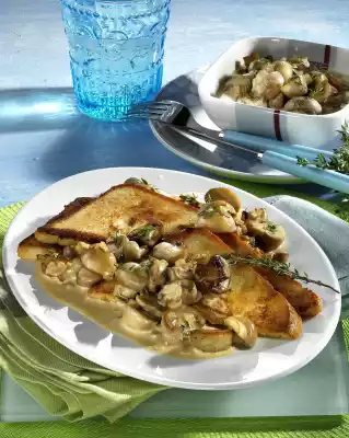 Arrange the mushroom ragout on a plate together with the French toast. Serve garnished with remaining thyme.