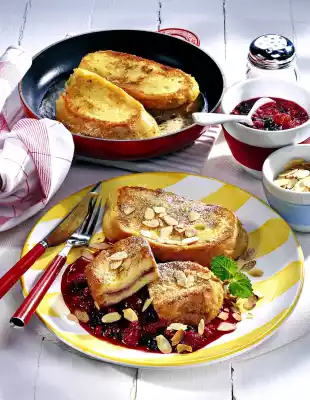 Spread 8 slices of bread with currant jelly and cover with the remaining slices of bread. Mix milk, eggs and vanilla sugar. Let the slices of bread soak for about 6 minutes. Turn the slices of bread after 3 minutes. In the meantime, roast almonds in a hot pan without fat until golden. Remove and put aside. Heat oil and fat in a large coated pan. Drain slices of bread and fry them in the pan for about 5 minutes, turning them over bit by bit. Degrease poor knights on kitchen paper, dust with icing sugar and arrange on plates with berry compote.