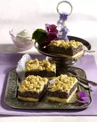 Bring 1/2 litre milk to the boil, pour over the poppy seeds and mix with the semolina porridge. Wash the orange and rub dry. First rub the peel thinly, then squeeze it. Stir almonds, rum, orange peel and orange juice and 2 eggs into the poppy seed mixture. Spread the mixture on the crumbled base and bake in a preheated oven (electric range: 200 °C/ convection oven: 175 °C/ gas: level 3) for approx. 15 minutes. Spread the remaining crumbles on the cake and bake for another 25-35 minutes until golden brown. Let the cake cool down on a cake rack