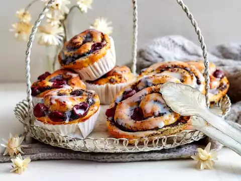 In the meantime, process the dough, poppy seed mixture and cherries as described up to and including cutting the roll into approx. 20 slices. Place 2 baking cups in approx. 20 troughs of 2 muffin sheets (12 troughs each).