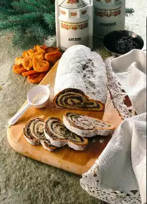 Line a baking tray (approx. 35 x 40 cm) with baking paper. Roll out dough on a little flour to a rectangle (approx. 30 x 35 cm). Spread the poppy seed mixture on top, leaving a 2 cm wide rim all around. Roll up the dough from the long side and press it slightly flat. Whip from the long side to 2/3. Place on a baking tray and pre-bake in a preheated oven (electric range: 200 °C/recirculating air: 175 °C/gas: level 3) for approx. 10 minutes. Then continue baking at 175 °C (fan oven: 150 °C/gas: level 2) for approx. 40 minutes