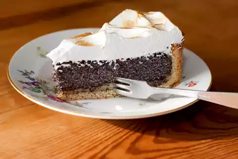For the meringue, whisk the egg whites and icing sugar with the whisks of the mixer until smooth, then beat at the highest setting for approx. 10 minutes to a shiny, firm mass. Remove the poppy seed cake from the tin and place on a cake plate.