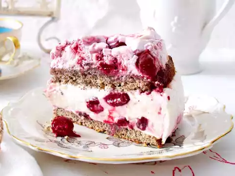 Stir cherry jam until smooth. Mix half the jam and 1⁄4 cherries and fold loosely into the meringue. Remove the cake from the oven. Turn down the temperature (electric cooker: 150 °C/circulating air: 125 °C/gas: see