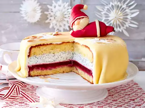 Roll out the rest of the light marzipan between the bags in a round shape (approx. 34 cm Ø). Carefully place on the cake and press on. Cut off any protruding edges. Place Santa Claus on top. Keep the cake cold until serving.