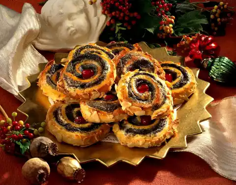 Mix flour and baking powder and knead. Roll out the quark and oil dough on a floured work surface to a square (approx. 36x36 cm). Spread poppy seed mixture on top, fold in sides and roll up. Separate the egg and coat the roll with egg white. Sprinkle almond flakes on the work surface and turn the roll in it (if necessary, press it down with your hands). Cut the roll into approx. 3 cm thick slices and distribute on 2 baking trays lined with baking paper. Halve the cherries and press one half into the middle of each snail. Bake the trays one after the other in a preheated oven (electric cooker: 200°C/ gas: level 3) for about 20 minutes. Mix egg yolk and remaining milk and brush the snails with it during the last 5 minutes of the baking time.