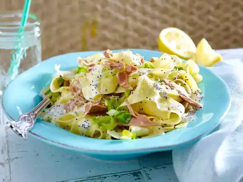 Clean and wash spring onions and cut into fine rings. Heat 1 tablespoon of oil in a pot, sauté the spring onions in it, remove. Add 1 tablespoon of oil and sauté the poppy seeds in it. Dust with flour and sauté briefly. Deglaze with wine and cream. Simmer for 5 minutes.
