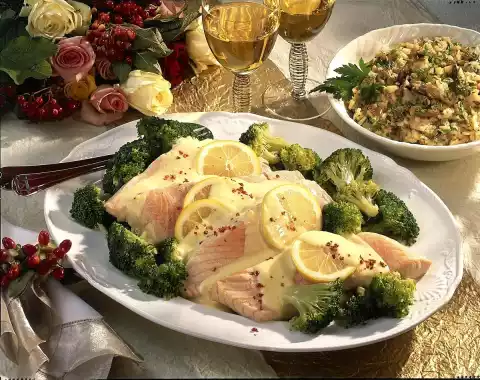 Add the sauce thickener while stirring and bring to the boil again briefly. Mix vermouth and egg yolk and stir into the sauce (do not boil any more). Season to taste with salt and pepper. Drain broccoli and add to the salmon slices on the plate.