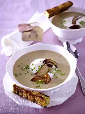Serve the soup in small bowls with a dollop of cream, slices of porcini mushrooms and the remaining chives. Add bread and cheese chips