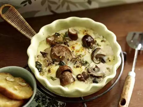 In the meantime preheat the grill of the oven. Cut the mozzarella into small pieces. Wash the herbs, shake dry and pluck the leaves or needles from the stems. Mix with crème fraîche and milk. Place the mushrooms with the herb crème fraîche and buffalo mozzarella in one large or two small, greased casserole dishes.