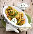 Bake on the middle rack under the hot grill for 6-8 minutes. Baguette goes well with it.