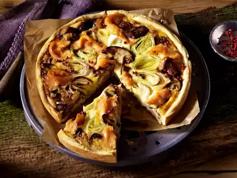 Grate cheese finely, whisk with cream and 2 eggs, season with salt and pepper. Pour about half of the egg cream on the dough. Cover with mushrooms and leek. Pour the rest of the icing over the dough. Pluck the salmon into pieces and spread on top. Bake in the preheated oven (electric cooker: 175 °C/ convection oven: 150 °C/ gas: see manufacturer) for 20-25 minutes. Cool lukewarm on a cake rack, garnish with pepper berries
