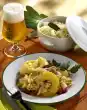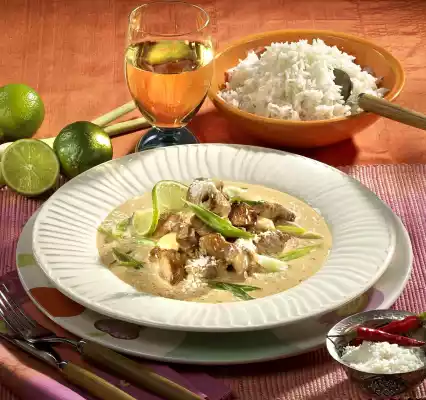 In the meantime heat oil in a pan. Fry the meat for 4-5 minutes in the oil and take it out. Sauté spring onions and garlic in frying fat. Dust with chilli powder. Add coconut milk, vegetable stock powder and lemon grass and bring to the boil. Cook over medium heat for about 8 minutes. Remove lemon grass. Add meat after 5-6 minutes. Season the shredded meat with lime juice. Drain rice if necessary.