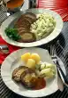 Cook over medium heat for about 8 minutes. Remove lemon grass. Add meat after 5-6 minutes. Season the shredded meat with lime juice. Drain rice if necessary. Arrange the coconut slices and rice on plates. Garnish with grated coconut and lime slices