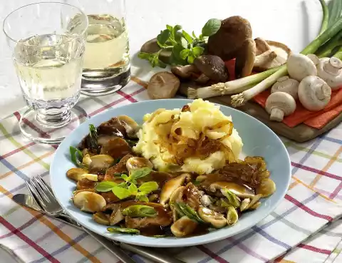Keep puree warm in a closed pot. Add the meat with the meat juice, mushrooms, spring onions, 2/3 of the marjoram and stock to the pan and bring to the boil. Add the sauce thickener and bring to the boil again. Season to taste with salt and pepper.