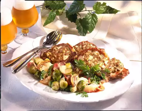 Clean and wash the Brussels sprouts and cook them in boiling salted water for about 20 minutes. Wash chops and pat dry. Fry them in 1-2 tablespoons of hot oil on each side for about 1 minute.