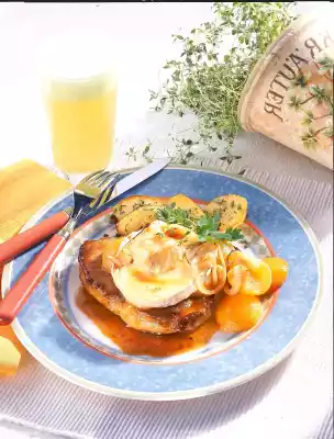 Fry the onions briefly in hot frying fat. Add stock and bring to the boil. Drain the apricots. Cut the cheese in half horizontally. Put apricots and cheese on the chops. Spread onions and stock over them