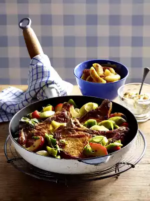 Heat 20 g clarified butter in a second pan, fry the potato noodles in it until golden brown, turning. Stir fried onions lightly into the sour cream. Add chops to the leek and apple vegetables in the pan and arrange.