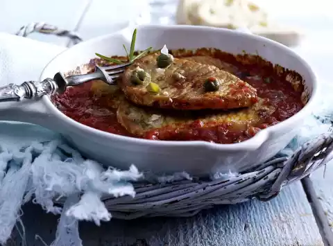 Season the sauce again. Serve everything, garnish with remaining capers. Ciabatta goes with it.