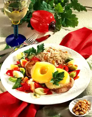 Season with salt and pepper and fry in the remaining oil on both sides for 3-5 minutes. Place two pineapple rings and a slice of cheese on each cutlet and bake briefly in a preheated oven (electric range: 250 ° C/ gas: level 5). Sauté the vegetables in the frying fat. Add pineapple pieces, mix pineapple juice and ketchup and pour on. Bring to the boil once and cook for about 10 minutes. Season with salt, pepper and paprika. Arrange one escalope au gratin with vegetables and rice on each plate
