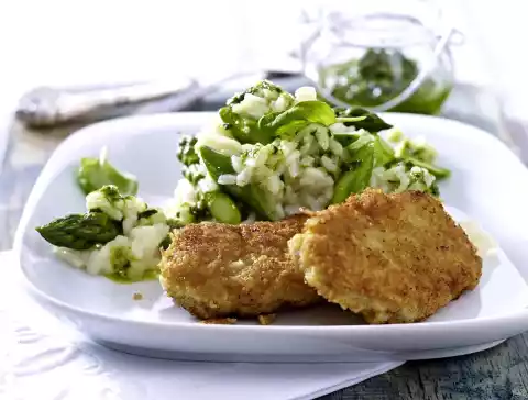 Stir 75 g parmesan into the risotto and season with salt and pepper. Finally fold in 1-2 tbsp. pesto. Serve the risotto with the cutlets and add some more pesto over the risotto or a blob on the cutlets as you like. Garnish with basil and sprinkle with pine nuts if desired