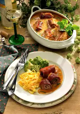 Sprinkle meat with salt and pepper. Wash the parsley, dab dry and remove the leaves. Cover cutlets with parsley leaves and ham slices, roll them up and pin them with wooden skewers. Heat the oil in a frying pan. Brown the meat roulades in it. Add wine and stock, bring to the boil. Cover and cook over medium heat for 1 hour. In the meantime, clean the cauliflower, wash it and cut it into florets. Cook for 15 minutes in boiling salted water. Cook pasta in boiling salted water for 10 minutes. Remove the roulades and keep warm. Stir cream and flour until smooth. Bind liquid with it. Add lemon juice, do not let it boil. Wash lemon balm and dab dry. Put something aside for garnishing. Peel 6 leaves and cut them into strips. Add grated lemon and lemon balm to the sauce. Season with salt and pepper. Heat butter and roast sesame seeds in it until golden brown. Toss the noodles in the sesame butter. Serve the roulades with the vegetables and noodles