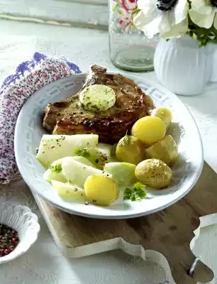 Meanwhile drain the potatoes and let them drain well. Put the potatoes back into the pot, add 20 g fat and some sea salt, toss through. Wash the chervil, shake dry and pluck the leaves. Arrange 1 cutlet, potatoes and kohlrabi on plates. Place 1 slice of herb butter on each cutlet and garnish with chervil
