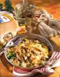 Drain the potatoes, add the milk mixture and mash them with a potato masher to make puree. Season to taste with salt and nutmeg. Remove meat from the pan and keep warm. Sauté the paprika and onion in the frying fat for about 4 minutes while stirring.