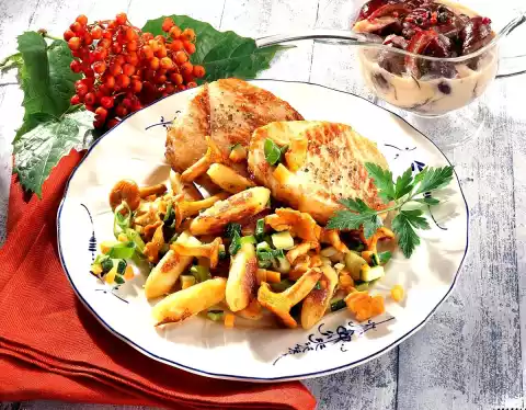With moistened hands form noodles about 5 cm long and put aside. Clean and wash the chanterelles. Peel or clean and wash the vegetables. Cut into fine cubes or rings. Fry in the remaining fat, add mushrooms and fry for about 3 minutes. Season with salt and pepper. Fry the potato noodles in a tablespoon of hot clarified butter until golden brown. Dab the meat dry and fry it in the remaining hot clarified butter on both sides for about 5 minutes. Season with salt and pepper. Arrange two chops each with some potato noodles and mushroom vegetables on a plate. Add pepper plums