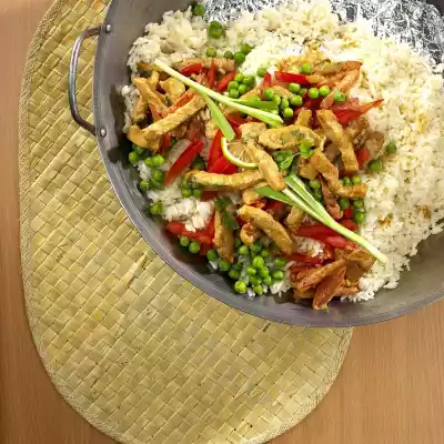 Put the rice in plenty of boiling salted water. Leave to soak for about 20 minutes. Meanwhile wash the meat, dab dry and cut into strips. Sprinkle with sherry and soy sauce, mix and leave to stand for approx. 15 minutes. In the meantime, wash, clean, quarter and seed the tomatoes.