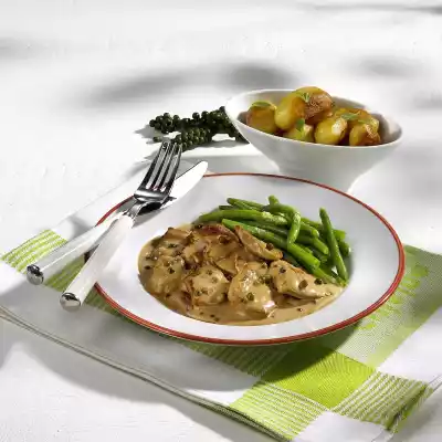 Sauté the shallots in the frying fat. Deglaze with stock and cream. Add peppercorns and simmer for about 5 minutes. Stir in sauce thickener, bring to the boil again. Add the meat to the sauce and warm it up.