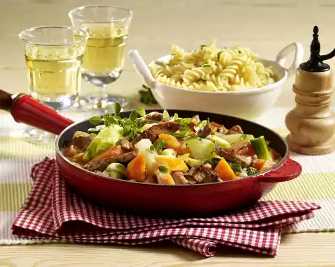 Heat the oil in a pan. Fry the meat for 4-5 minutes, turning it over and taking it out. Brown the carrots and kohlrabi in the pan, deglaze with broth and simmer in the closed pan for 6-8 minutes.