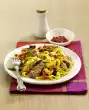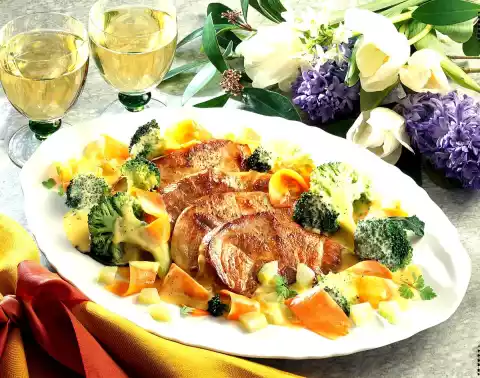 Add the carrots in the last three minutes and cook until done. Drain vegetables, collect vegetable water and measure 1/8 litre. Wash meat, dab dry and season with salt and pepper. Heat oil in a pan and fry the escalopes on each side for three minutes.