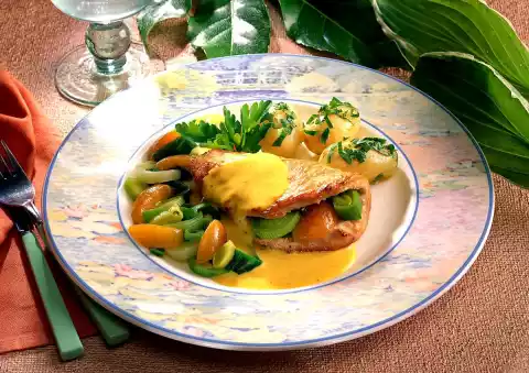 Season to taste with curry. Drain and peel the potatoes. Heat butter and toss potatoes. Wash parsley, dab dry and cut into strips except for a little bit for garnishing. Pour curry sauce over filled cutlets and arrange with vegetables and potatoes.