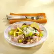Wash the potatoes thoroughly and cook in salted water for about 20 minutes. Wash the meat, dab dry, tap flat and spread with mustard. Clean and wash spring onions and cut into rings.