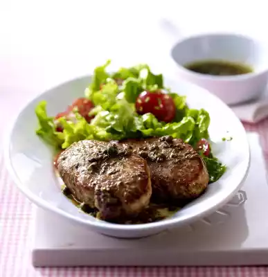 Arrange salad and 2 small cutlets each sprinkled with caper anchovy butter and capers