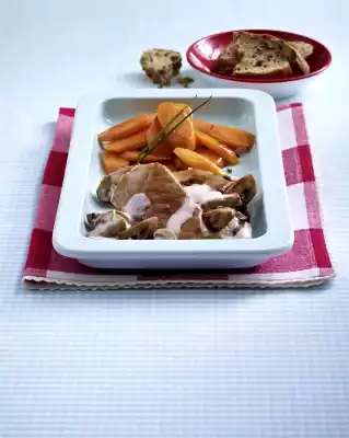 Heat in a coated pan spread with 1/2 teaspoon oil, add escalopes and fry on each side for about 4 minutes, remove from the pan and keep warm. Fry the mushrooms for 3-4 minutes. Dust with flour and sauté. Deglaze with stock and cream, bring to the boil and simmer for about 3 minutes. Season mushroom sauce with salt and pepper