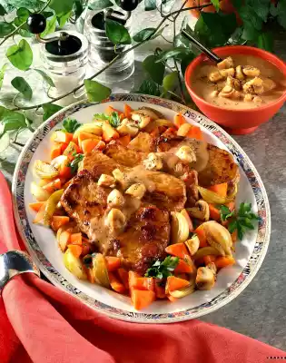 Onions peel and cut into slices. Peel carrots and cut into small pieces. Clean, wash and quarter the mushrooms. Fry onions in 20 g fat, add carrots, deglaze with 100 ml water and stew for about 10 minutes.