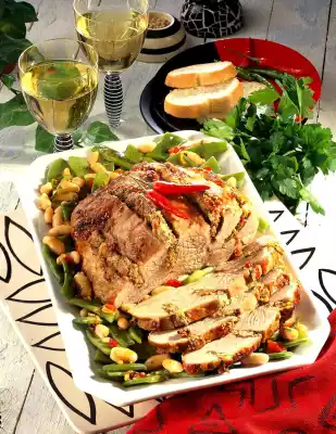 Sprinkle in sauce thickener. Season to taste with salt and cayenne pepper. Warm the beans and bean seeds in the sauce. Remove kitchen string from the roast. Cut the roast open and serve with the vegetables and sauce. Garnish with chilli peppers as desired
