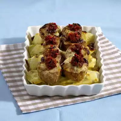 Sauté the onion cubes in it until translucent, deglaze with the white wine and top up with cream. Cut gorgonzola roughly into pieces and dissolve in the cream. Put fennel slices in an ovenproof dish, place medallions on top and pour the sauce over them. Cook in the preheated oven (electric cooker: 175 °C/ convection oven: 150 °C/ gas: level 2) for 15-20 minutes. In the meantime, drain the dried tomatoes, cut them into cubes and mix them with the pink berries. Take the casserole out of the oven and spread the tomato mixture on the medallions