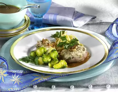Stir in gravy powder, bring to the boil briefly. For the medallion cap, wash and chop the parsley. Chop the walnuts. Mix with cream cheese and spread evenly on the medallions. Shortly before serving, bake in a preheated oven (electric: 225 °C/ gas: level 4) for 3-4 minutes.