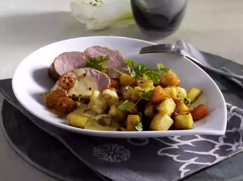 Cut the meat into slices and arrange on plates with the potato and carrot vegetables. Garnish with chervil. Pour a little sauce, garnish with pink berries and sugared kumquats.
