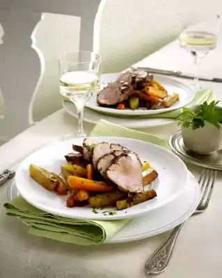 Remove meat from the oven and let it rest for a short time. Season vegetables to taste. Cut meat open and arrange on plates with the braised vegetables. Drizzle with the gravy and sprinkle with parsley.