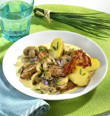 Also season with salt and pepper. Dust with flour. Add stock and cream while stirring, let simmer for 5 minutes. Add fillet again. Season everything with salt and pepper and sprinkle with chives. Cut bacon into pieces and leave it crispy. Swivel potato halves in the bacon fat and serve with the ragout