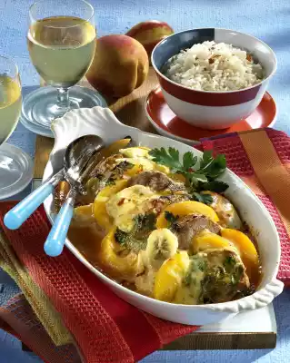 Peel bananas and cut them into thick slices. Mix fillet and fruit. Put them into a large casserole dish. Mix cream, ketchup and curry and spread over the meat. Sprinkle cheese over it and roast in the preheated oven (electric cooker: 200 °C/ gas: level 3) for approx. 25 minutes