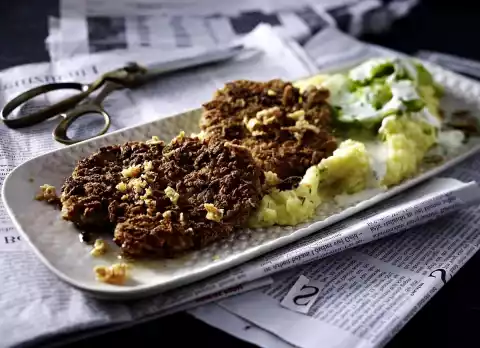For the breading, finely crumble the fried onions. Mix the fried onions and breadcrumbs. Wash the meat, dab dry and cut into about 8 medallions. Tap flat between foil