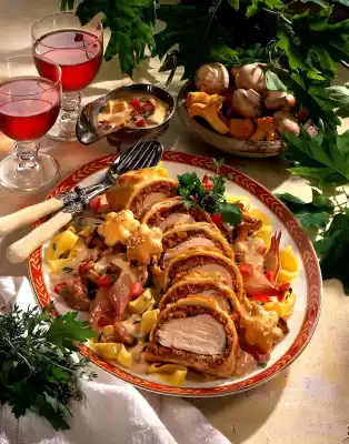 Moisten the edges of the puff pastry with water and wrap the fillets in the pastry. Roll out the rest of the puff pastry sheet and cut out small flowers. Moisten with water and decorate the fillet rolls with it. Place the fillets on a baking tray lined with baking paper and bake in a preheated oven (electric range: 200 °C/ gas: level 3) for approx. 25 minutes.